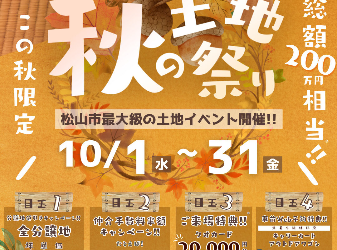 ≪完全予約制≫ ~10月31日(金)まで、松山市最大級の「秋の土地祭り」開催中です! 最新の土地情報やお得な特典までついてます♪...