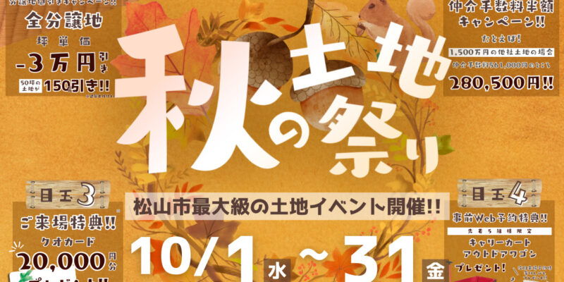 <blockquote class="wp-embedded-content" data-secret="2PMzuJLpLT"><a href="https://hinokiya-ehime.com/event/30768/">【秋限定】松山市最大級の【秋の土地祭り】</a></blockquote><iframe sandbox="allow-scripts" security="restricted" src="https://hinokiya-ehime.com/event/30768/embed/#?secret=2PMzuJLpLT" width="600" height="400" title="“【秋限定】松山市最大級の【秋の土地祭り】” — 桧家住宅愛媛|愛媛県松山市" data-secret="2PMzuJLpLT" frameborder="0" marginwidth="0" marginheight="0" scrolling="no" class="wp-embedded-content"></iframe><script type="text/javascript"> /*! This file is auto-generated */ !function(c,d){"use strict";var e=!1,o=!1;if(d.querySelector)if(c.addEventListener)e=!0;if(c.wp=c.wp||{},c.wp.receiveEmbedMessage);else if(c.wp.receiveEmbedMessage=function(e){var t=e.data;if(!t);else if(!(t.secret||t.message||t.value));else if(/[^a-zA-Z0-9]/.test(t.secret));else{for(var r,s,a,i=d.querySelectorAll('iframe[data-secret="'+t.secret+'"]'),n=d.querySelectorAll('blockquote[data-secret="'+t.secret+'"]'),o=new RegExp("^https?:$","i"),l=0;l<n.length;l++)n[l].style.display="none";for(l=0;l<i.length;l++)if(r=i[l],e.source!==r.contentWindow);else{if(r.removeAttribute("style"),"height"===t.message){if(1e3<(s=parseInt(t.value,10)))s=1e3;else if(~~s<200)s=200;r.height=s}if("link"===t.message)if(s=d.createElement("a"),a=d.createElement("a"),s.href=r.getAttribute("src"),a.href=t.value,!o.test(a.protocol));else if(a.host===s.host)if(d.activeElement===r)c.top.location.href=t.value}}},e)c.addEventListener("message",c.wp.receiveEmbedMessage,!1),d.addEventListener("DOMContentLoaded",t,!1),c.addEventListener("load",t,!1);function t(){if(o);else{o=!0;for(var e,t,r,s=-1!==navigator.appVersion.indexOf("MSIE 10"),a=!!navigator.userAgent.match(/Trident.*rv:11\./),i=d.querySelectorAll("iframe.wp-embedded-content"),n=0;n<i.length;n++){if(!(r=(t=i[n]).getAttribute("data-secret")))r=Math.random().toString(36).substr(2,10),t.src+="#?secret="+r,t.setAttribute("data-secret",r);if(s||a)(e=t.cloneNode(!0)).removeAttribute("security"),t.parentNode.replaceChild(e,t);t.contentWindow.postMessage({message:"ready",secret:r},"*")}}}}(window,document); </script>