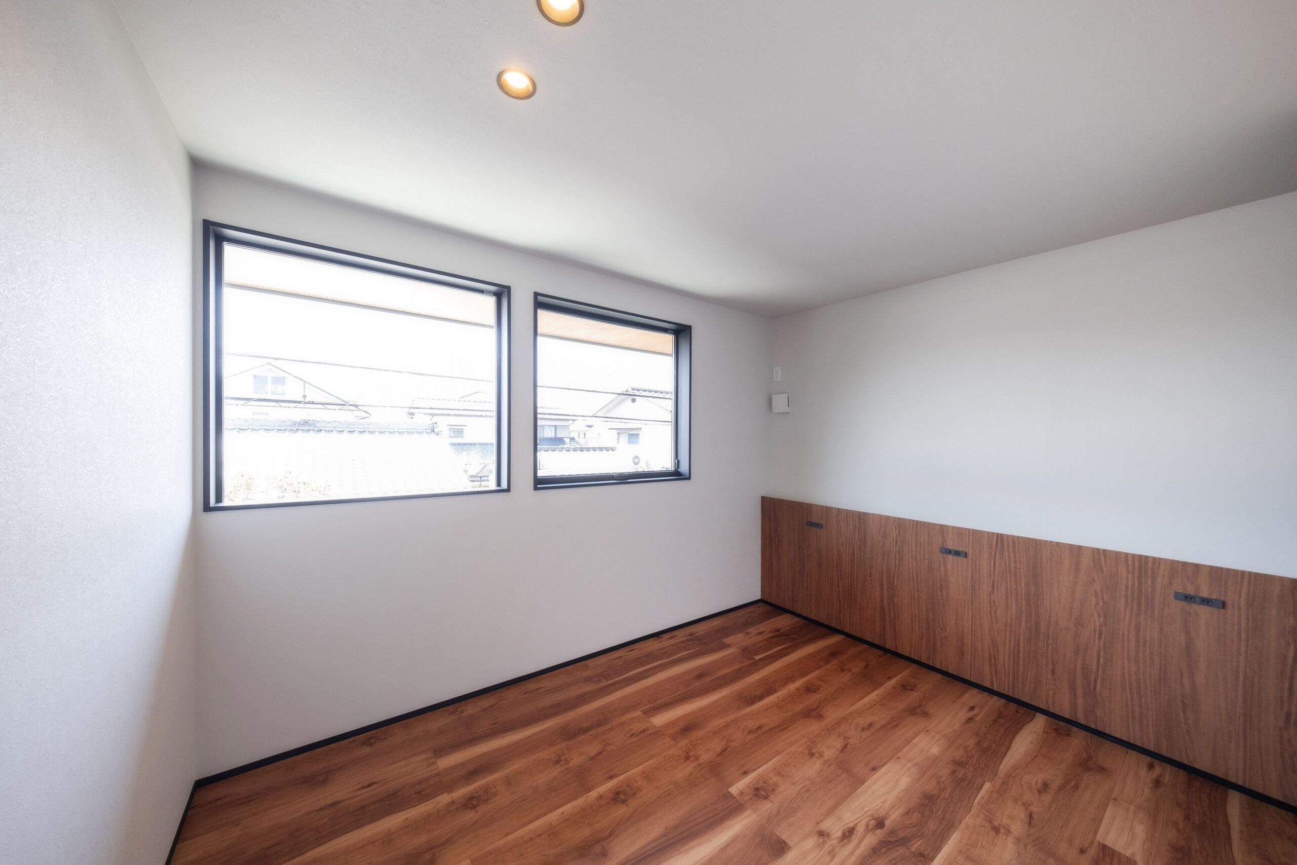 また、部屋の一面に床材と色味を合わせた濃いブラウンの木目調パネルが採用されています。
