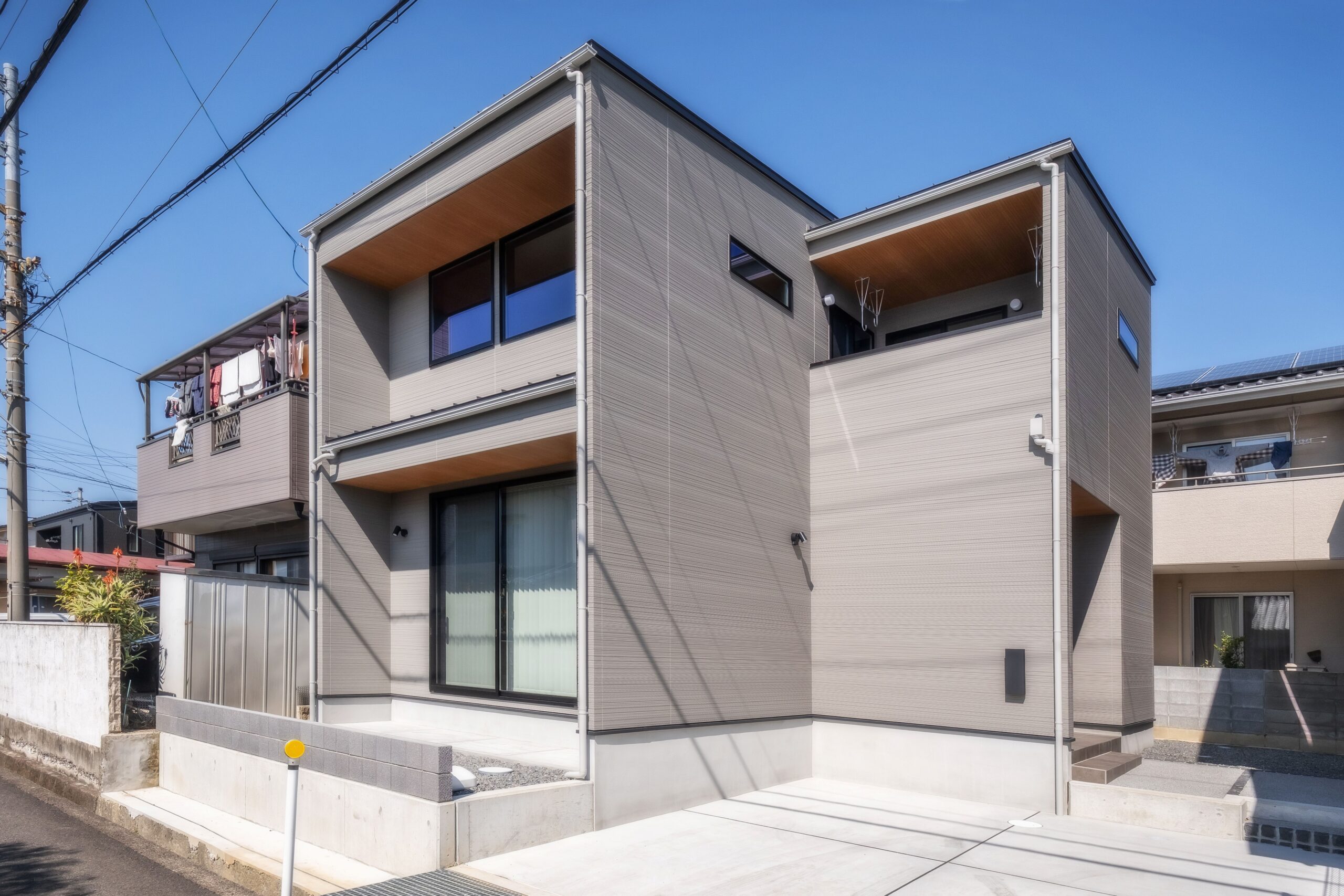 グレーの外壁に、木目調の軒天と黒サッシがモダンなアクセントを加える、