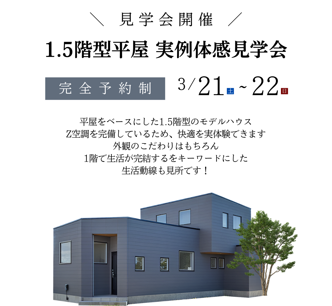 HOME > イベント情報 > 体験会 > 【全館空調】1.5階型平屋!実例体感見学会【オーナー様邸見学会】