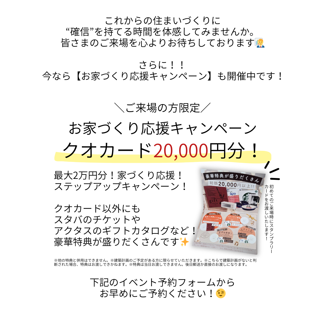 | 備考 | WEBからの事前来場予約でQuoカード20,000円分プレゼント! |
