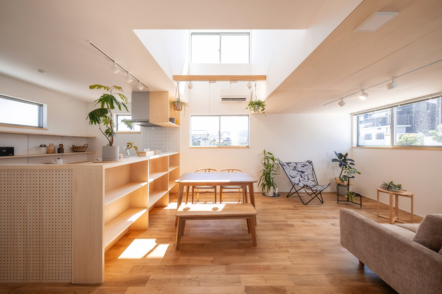 照明レールを植物のハンギングスペースとして活用するなど、日常に彩りを添える工夫が凝らされています。