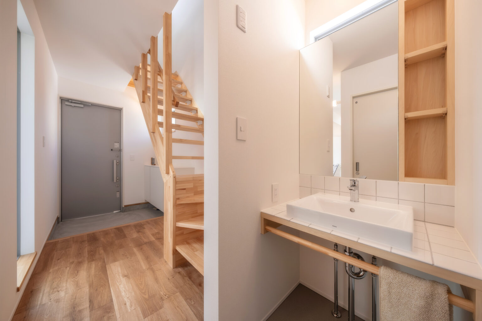 木製のタオル掛けなど、既製品にはない細やかな配慮が、日々の暮らしを豊かに彩ります。